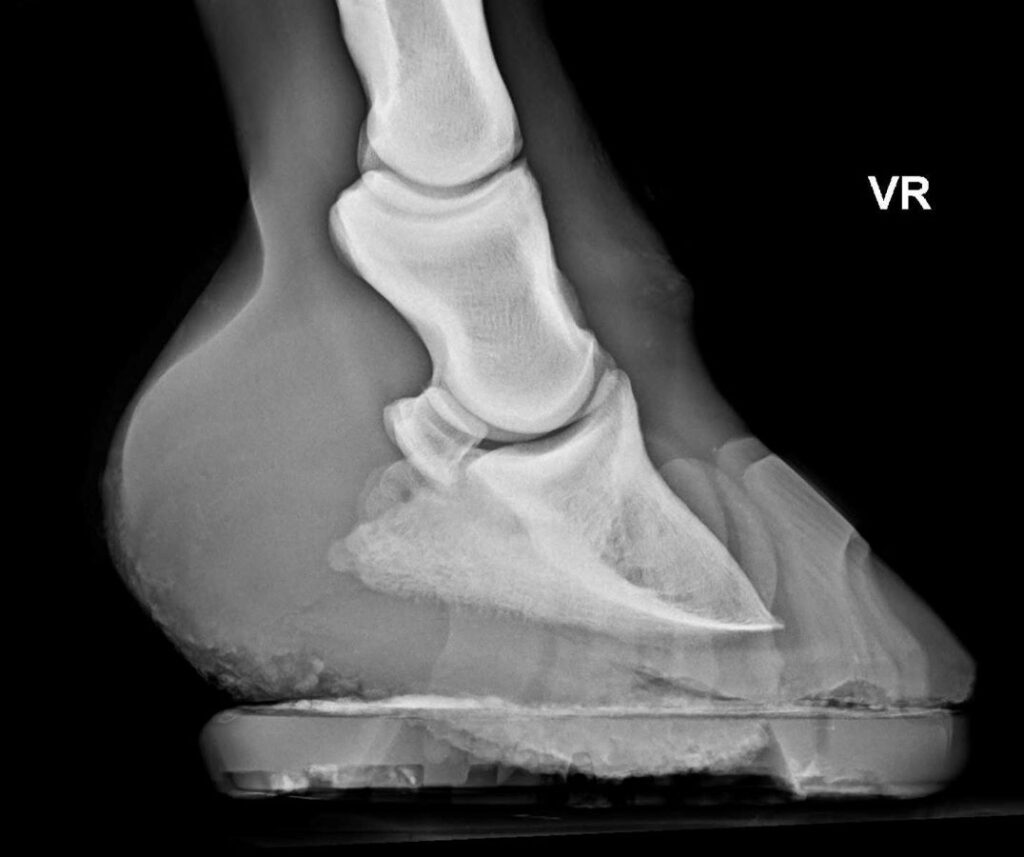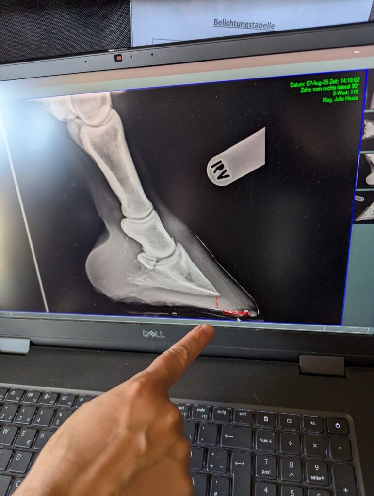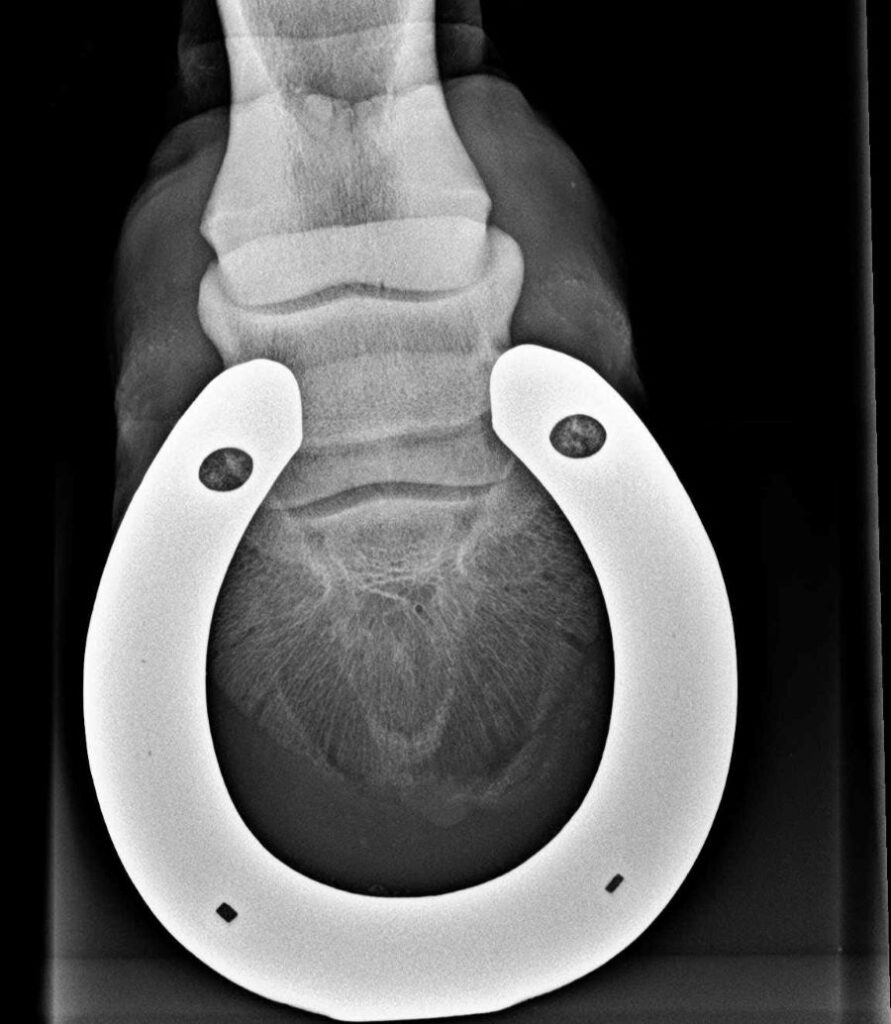Wenn dein Pferd Hufeisen hat, ist es sehr ratsam, diese vor dem Röntgen von deinem Hufprofi abnehmen zu lassen. Ein Hufeisen auf dem Röntgenbild ist wie ein massiver Balken vor der Aussicht. Das Metall verursacht starke Streustrahlung, das Bild wird um das Eisen herum unscharf oder überbelichtet und natürlich verdeckt das Eisen auch Teile der relevanten Strukturen. Feine Details wie Haarrisse können so übersehen werden, der Hufbeinrand oder Teile des Strahlbeins werden verdeckt. Zudem verfälscht der Beschlag die Beurteilung der Sohlendicke. Für eine verlässliche Diagnose führt daher kein Weg daran vorbei: Das Eisen muss runter.