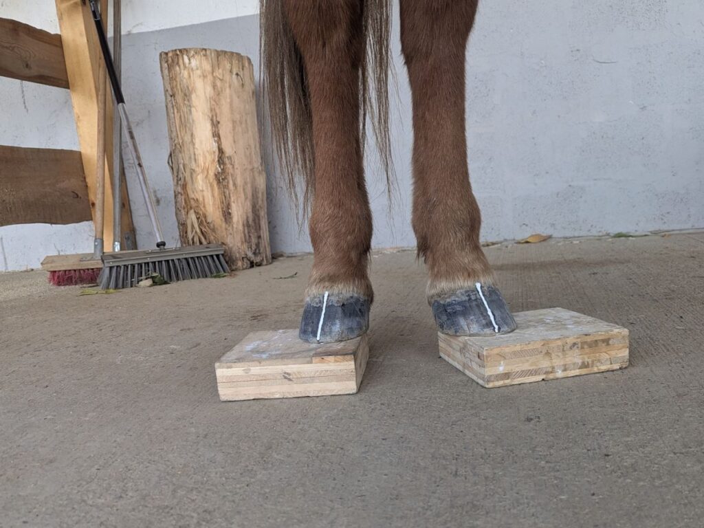 - Stelle das Pferd mit beiden Vorderhufen auf Holzbretter oder Podeste, denn genau das passiert beim Röntgen.